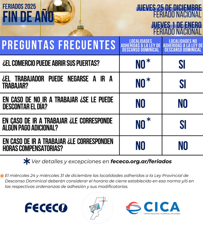 El Centro Industrial y Comercial de Avellaneda (CICA) y el Centro Unión Empleados de Comercio de Avellaneda (CUECA) sugieren a los comercios de la ciudad tener empatía con sus trabajadores y cerrar las puertas los días 24 y 31 de diciembre de 2025 a las 19 horas; y a los vecinos a realizar sus compras con anticipación.