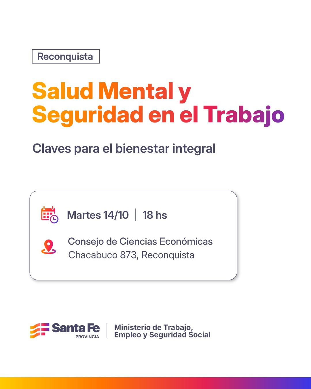 El próximo martes 14 de octubre a las 18 horas, en el Consejo de Ciencias Económicas, se desarrollará el encuentro “Salud Mental y Seguridad en el Trabajo: claves para el bienestar integral”, organizado por el Ministerio de Trabajo, Empleo y Seguridad Social de la provincia de Santa Fe.