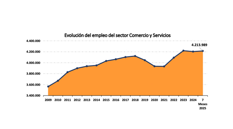 De acuerdo a un informe elaborado por la Cámara Argentina de Comercio y Servicios (CAC), a partir de la información publicada por la Secretaría de Trabajo, Empleo y Seguridad Social, en el mes de julio de 2025 el sector Comercio y Servicios incrementó en 20.035 la cantidad de trabajadores privados registrados respecto al mismo período de 2024. De esta forma la variación interanual fue de 0,5%.