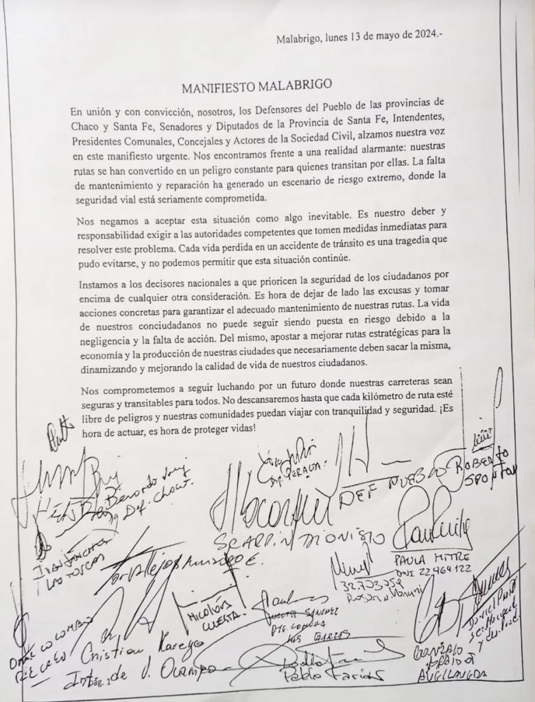 Por esto, Jorge Soto y Milton Raffin, presidentes de los centros comerciales de Malabrigo y de Avellaneda respectivamente, participaron de la firma de este manifiesto que insta al gobierno nacional a tomar medidas inmediatas, y establece un compromiso a seguir trabajando en conjunto para garantizar que nuestras rutas sean seguras y libres de peligros para todos los ciudadanos.