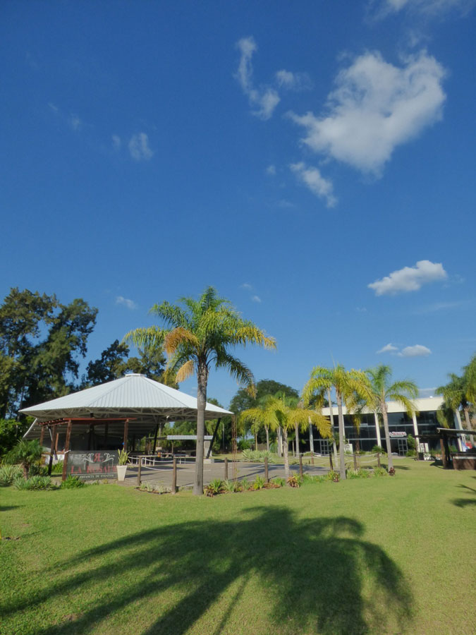 El salón principal tiene capacidad para 300 personas y el predio incluye un amplio parque con palmeras y follaje verde, además de una estructura semicubierta ideal para ceremonias, recepciones o eventos al aire libre con sombra.