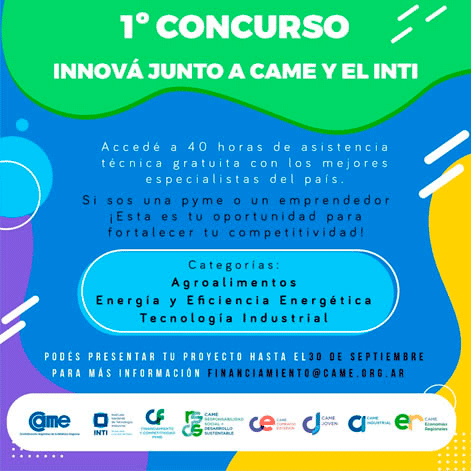 El Departamento de Programas de Financiamiento y Competitividad Pyme de la Confederación Argentina de la Mediana Empresa (CAME) se complace en anunciar el Lanzamiento del Concurso “Innová junto a CAME y el INTI”.