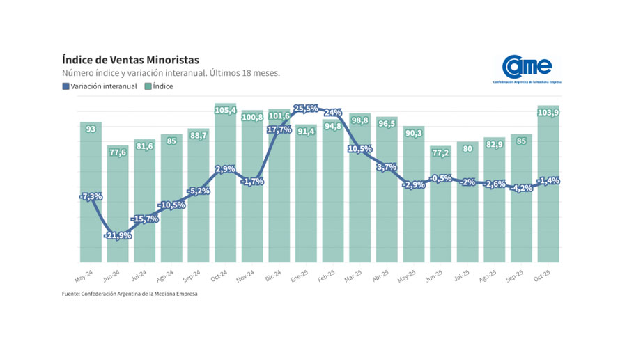 En octubre, las ventas minoristas pymes mostraron una leve mejora mensual, aunque continuaron por debajo del nivel del año anterior. La mayoría de los rubros registró caídas interanuales, con “Perfumería” y “Bazar y decoración” entre los más afectados. Las promociones y el Día de la Madre impulsaron transitoriamente la demanda, sin revertir la tendencia general de consumo prudente. Los comercios encuestados destacaron mayores costos operativos, baja rentabilidad y escaso acceso al financiamiento. Predomina la cautela en las expectativas y la baja disposición a invertir.