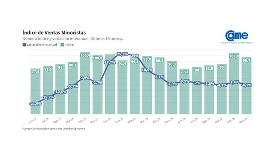 En noviembre, las ventas minoristas pymes registraron una variación interanual de -4,1% a precios constantes. En tanto, en la comparación mensual desestacionalizada, la variación fue de -9,1%. En lo que va del año las ventas acumulan un incremento interanual del 3,4%.
