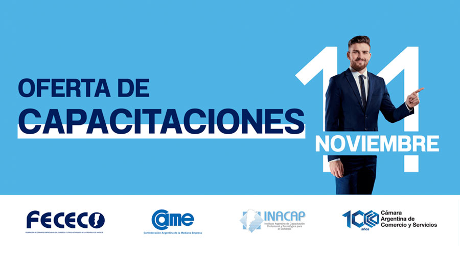 La Federación de Cámaras Empresarias del Comercio y Otras Actividades de la Provincia de Santa Fe (FECECO) informa a sus entidades adheridas que el Instituto Argentino de Capacitación Profesional y Tecnológica para el Comercio (INACAP), junto con la Confederación Argentina de la Mediana Empresa (CAME) y la Cámara Argentina de Comercio y Servicios (CAC), han puesto a disposición la oferta de capacitaciones correspondiente al mes de noviembre.