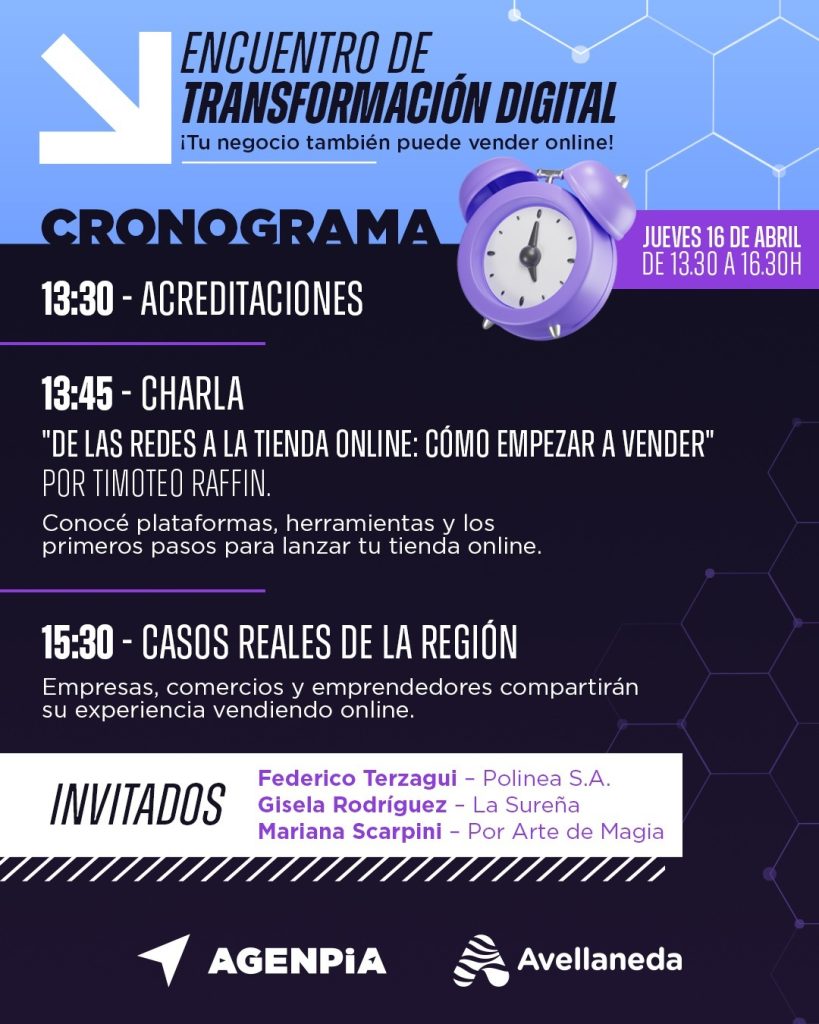 ¡Tu tienda online puede ser el próximo paso para hacer crecer tu negocio! Las entradas son gratuitas con inscripción ➡ https://passgo.com.ar/e/encuentro-de-transformacion-digital/528 ¡Te esperamos! Sigamos impulsando innovación juntos Invitan: AGENPiA y Municipalidad de Avellaneda
