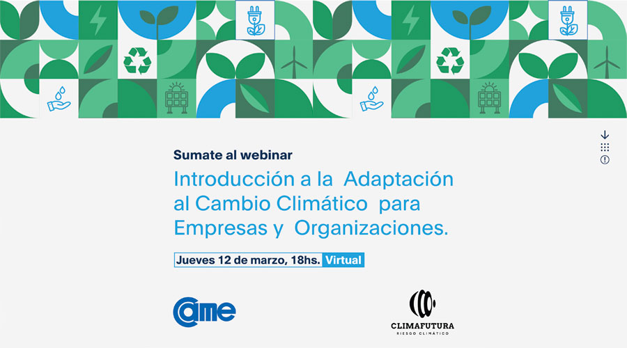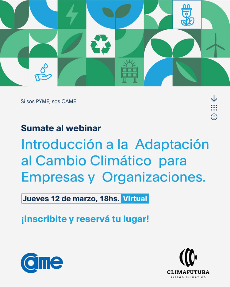 Desde el departamento de Responsabilidad Social y Desarrollo Sostenible de la CAME junto al sector de Economías Regionales y la Escuela de Negocios de la entidad, en alianza con ClimaFutura, invitamos a entidades, pymes y emprendedores a ser parte de este espacio virtual, federal y gratuito que se desarrollará el próximo 12 de marzo, a las 18 h.