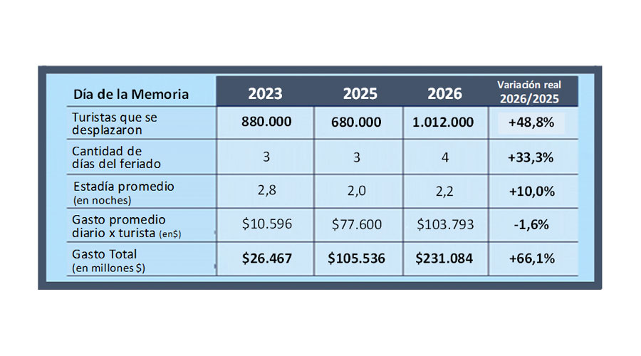 – El gasto promedio diario fue de $ 103.793, un 7% menor al gasto del feriado de Carnaval de febrero último. Esto se explica a partir de que los turistas eligieron destinos más cercanos y también porque entre los gastos recreativos no existió la oferta del Carnaval. En cambio, prevalecieron actividades culturales y conmemorativas por el 24 de marzo, casi todas de acceso gratuito. También fue un 1,6% menor al feriado de la Memoria del año pasado, comparado a precios reales.