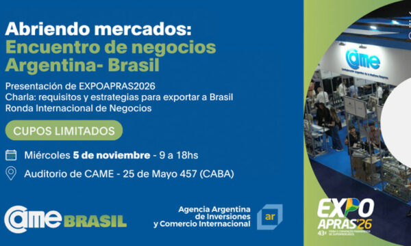 La Confederación Argentina de la Mediana Empresa (CAME) invita a pymes a participar de la jornada “Abriendo mercados: encuentro de negocios Argentina- Brasil”, el 5 de noviembre.